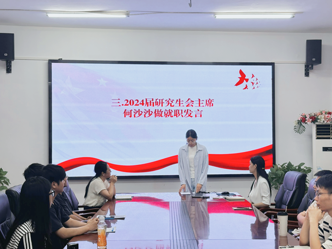 新一届研究生会主席何沙沙表态发言。她表示要坚定做好研学会工作的信心,高质量高效率配合学校和学院开展学生工作。