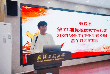 第71期优秀学员代表2021级化工与制药类04班董午轩同学对学院党委提供的学习、交流平台表示感谢,并呼吁本期学员要加强个人修养,深化党性意识,要用党员的要求严格要求自己。