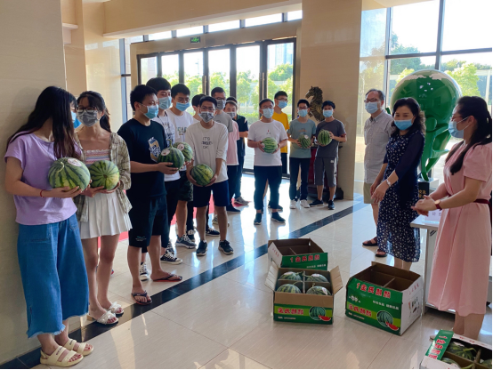 学院党委书记王雪梅、党委副书记周丹、副院长龙思会,专程到校慰问返校研究生,在炎炎夏日里为学生们送去清凉解暑的西瓜,并和学生们亲切交谈,了解他们在生活、学习方面的需求和困难,提醒同学们防控措施常抓不懈,坚持适度锻炼、养成良好生活习惯,保持积极乐观的心态面对疫情防控常态化管理下的新变化与新挑战。