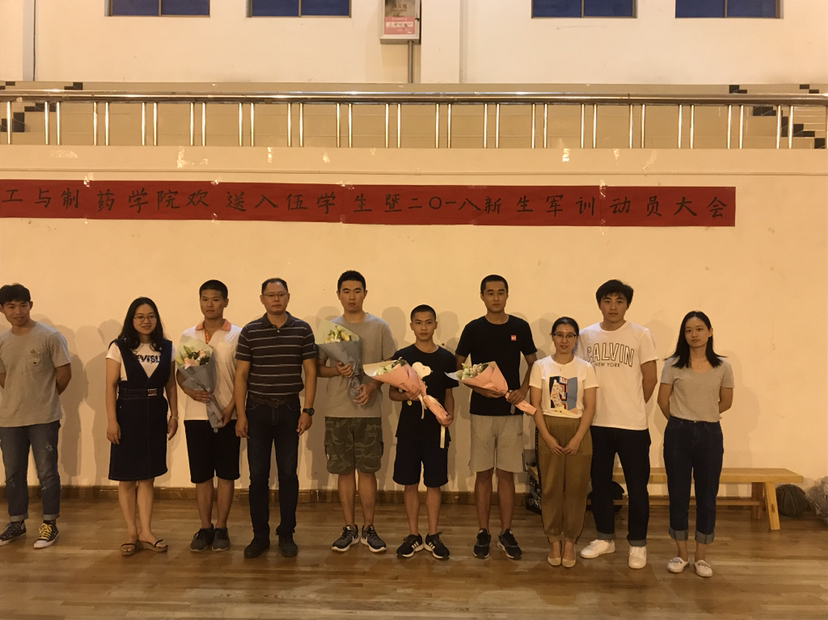 动员大会上,郭嘉教授与全体辅导员为入伍新兵们献花,并与新兵合影留念。