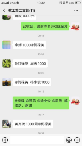 主题党日活动期间,各支部在微信群、QQ群发布相关倡议书后,学院党政领导班子、支部书记、老党员们带头响应,踊跃捐款支持疫情防控工作,青年党员教师们也第一时间向所在支部献出爱心,短短24小时之内,就累计捐款24000元,疫情以来,党员本人通过其它途径捐款18000元。截止3月4日,学院共计88名党员共计捐款42000元。党员教师们表示,大家隔离在家虽然不能亲赴战“疫”一线,但是仍然希望尽自己的微薄之力支援抗疫工作,将自己的微小爱心传递到抗疫一线的英雄们。
