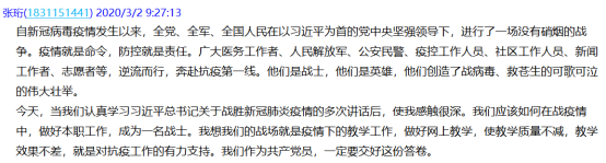 教工二支部、四支部党员教师通过学习强国视频会议,分享了自己在疫情期间的生活状态、所思所想,大家针对如何更好地开展网络教学、如何帮助身边师生在疫情防控期间,做到安全、高效的学习和工作进行了讨论;教工三支部、五支部党员畅所欲言,积极分享自己的“战疫情”思想汇报,就疫情发展变化情况、疫情中发生的感人事迹谈论了自己的切身感受。