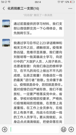两位支部书记强调党员教师们要坚决贯彻落实党中央和学校、学院党委对疫情防控的部署要求,带头做疫情防控的宣传员、服务员、守门员,同时也提醒支部党员做好工作规划、扎实开展线上教学,坚定必胜信念、勠力同心、抗击疫情。
