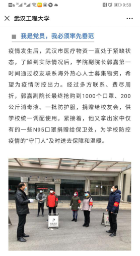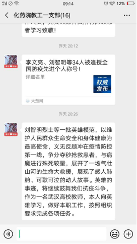 教工各支部通过支部群里集中学、全体党员自觉学的形式,重点学习《中共湖北省委关于追授刘智明同志“全省优秀共产党员”的决定》和抗“疫”一线优秀共产党员事迹,营造出学习先进、争当先进的良好氛围。主题党日活动中,教工四支部共同学习了支部党员干部、“有关人才计划”郭嘉教授向校友会捐赠物资、主动申请参加社区疫情防控工作的事迹,畅谈心得体会;教工二支部、科研二支部则通过学习强国、QQ群围绕所在支部党员李雁博、龙秉文两位“湖北省教育厅有关人才计划学子”积极报名工大社区疫情防控志愿工作的事迹,交流自己的所闻所感。