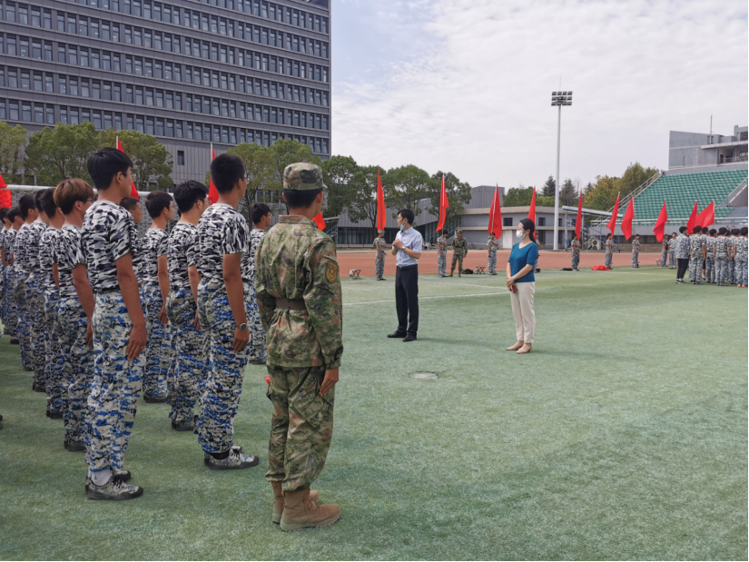 汪铁林向承训教官表示感谢,并嘱托同学们服从教官指挥和军训安排,严格遵守校园疫情防控要求,要通过军训进一步提高国防意识和政治觉悟,培养集体主义精神,激发爱国热情和家国情怀,为接下来的大学生活打下坚实的基础。