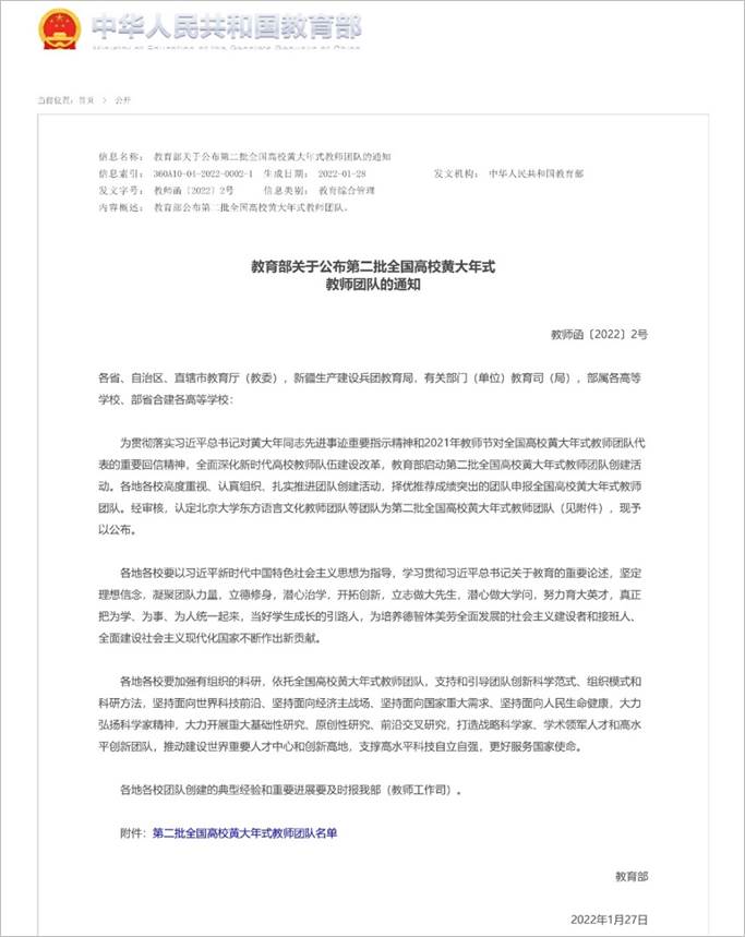 据悉,教育部于2018年公布首批全国高校黄大年式教师团队。2021年教师节前夕,教育部启动第二批全国高校黄大年式教师团队创建活动,持续推进团队创建工作,全国共有200个教师团队获得认定,其中湖北省有8所高校的教师团队上榜。