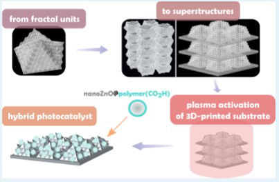 该研究的创新点及其科学意义如下:1)利用氧化锌光催化活性产氢气;2)设计并3D“打印”具有分形结构的聚合物基质,增加光催化反应面积;3)首次结合核壳技术、等离子体接枝技术以及3D打印技术获得了功能化的复合物。从几何、尺寸和微观结构对光催化剂进行了改进,从而提高产氢气的效率。