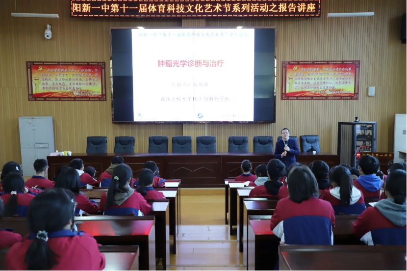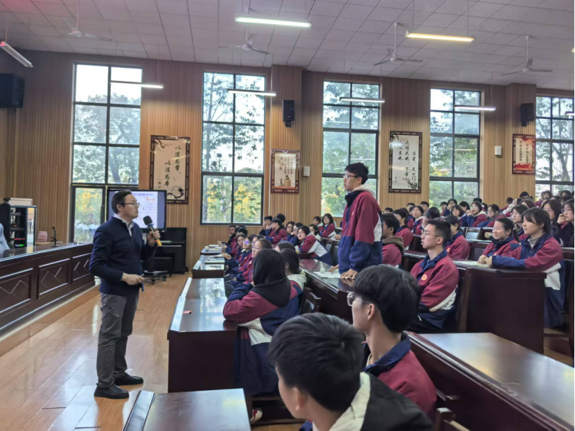 吴风收教授聚焦“肿瘤光学诊断与治疗”,为百余名高三学生作专题报告。在讲座中,吴风收教授深入浅出地向高三学子介绍肿瘤光学诊断与治疗这一前沿领域。他从基础概念讲起,逐步深入到复杂的技术原理和应用前景,结合生动的临床案例和形象的图片、视频资料,让同学们对这一专业性极强的领域有了初步的认识和理解。同学们不仅全神贯注地聆听,还认真记录着关键知识点。